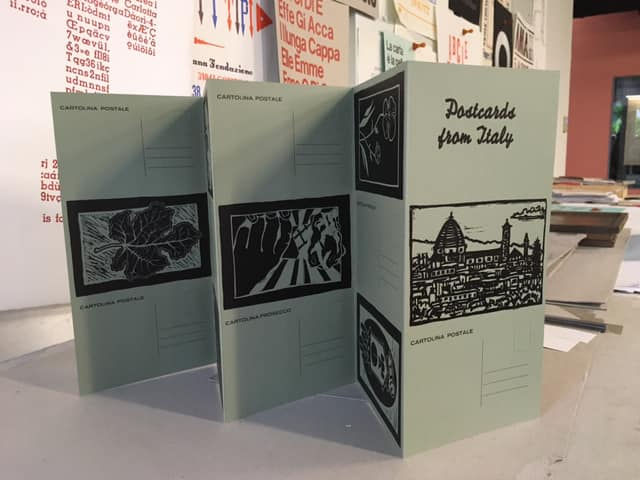 Our guest instructor, Lucio, helped us conceptualize and produce our book in only three days. We made Postcards from Italy by using linocut printing blocks and hand set lead type. We hand carved the block with any image we saw fit, and accompanied the picture with a poem or story we wrote. With Lucio to guide us, we printed our images and paragraphs using a mechanized press. The pages and book covers were then hand bound by us.